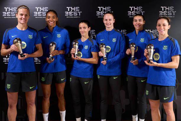 接下来是年度最佳女足门将奖,效力芝加哥红星队的美国国门阿丽莎·内赫尔当选,她作为主力门将帮助美国女足在今夏的巴黎奥运会上夺得金牌。美国女足主教练埃马·海耶斯获得年度最佳女足教练奖,她上赛季率领切尔西女足实现英超五连冠,接手美国女足后又率队奥运夺金。年度女足最佳阵容也同时公布,欧冠冠军巴萨女足和奥运冠军美国女足占据了11人中的绝大多数。